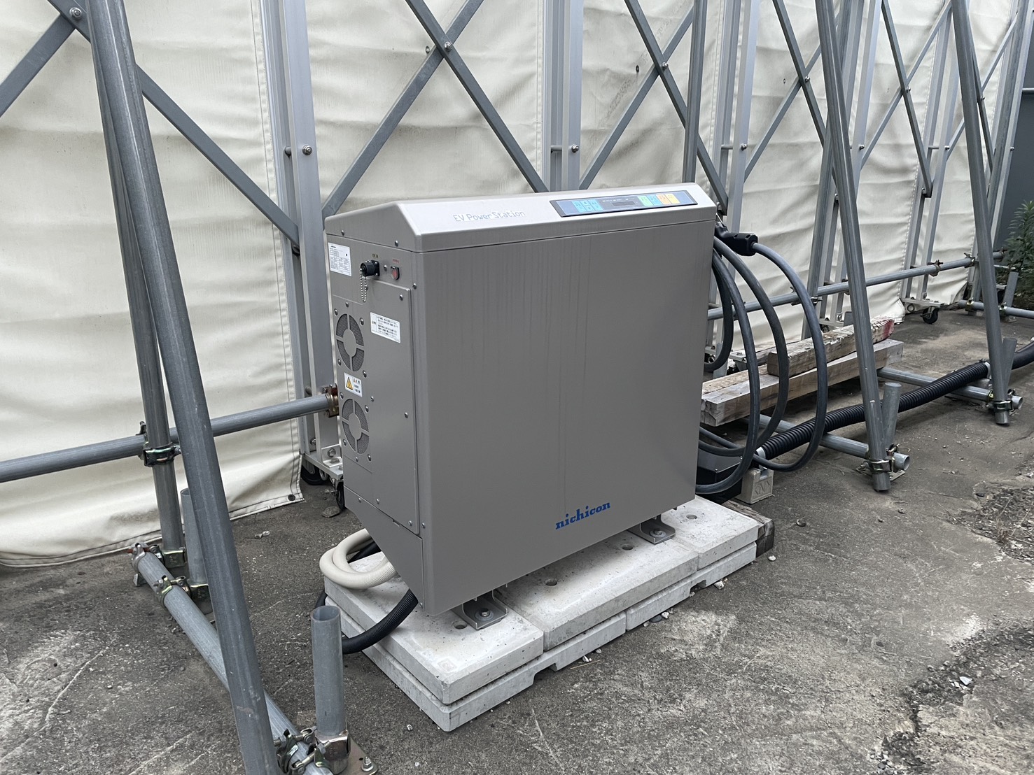 今回導入したV2H。越谷の事業所にも設置され、どちらの拠点でもEVの充電を、ソーラーカーポートで発電した電力を利用し、可能にしている。
