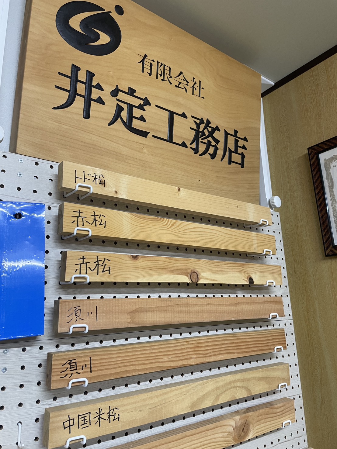 井定工務店様の会議室には主に使用している木材が飾られていました。